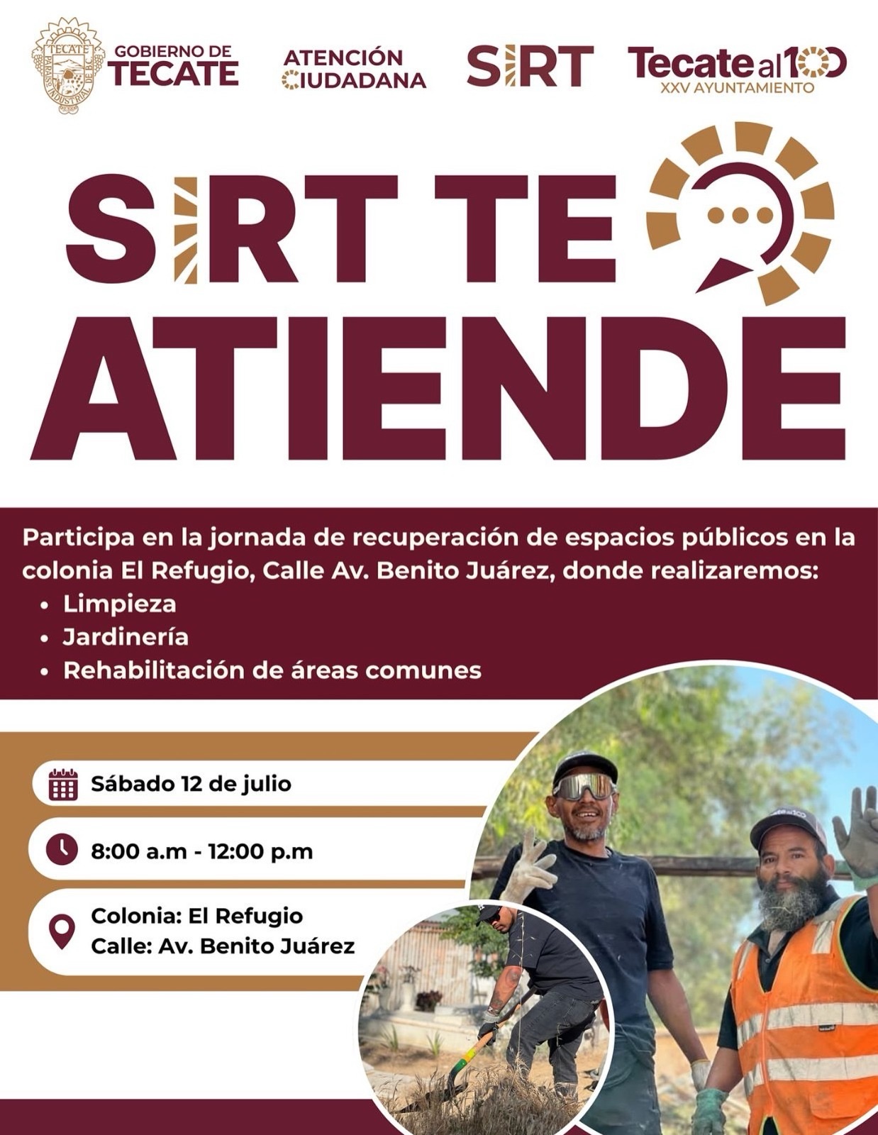 Tecate, Baja California a 11 de julio de 2025.- Con el compromiso de fomentar entornos más limpios, seguros y agradables para las familias tecatenses, el Gobierno de Tecate, a través del área de Servicios Integrales de Residuos de Tecate (SIRT), en coordinación con la Dirección de Atención Ciudadana, invita a la comunidad a participar en la jornada de recuperación de espacios públicos en la colonia El Refugio.
