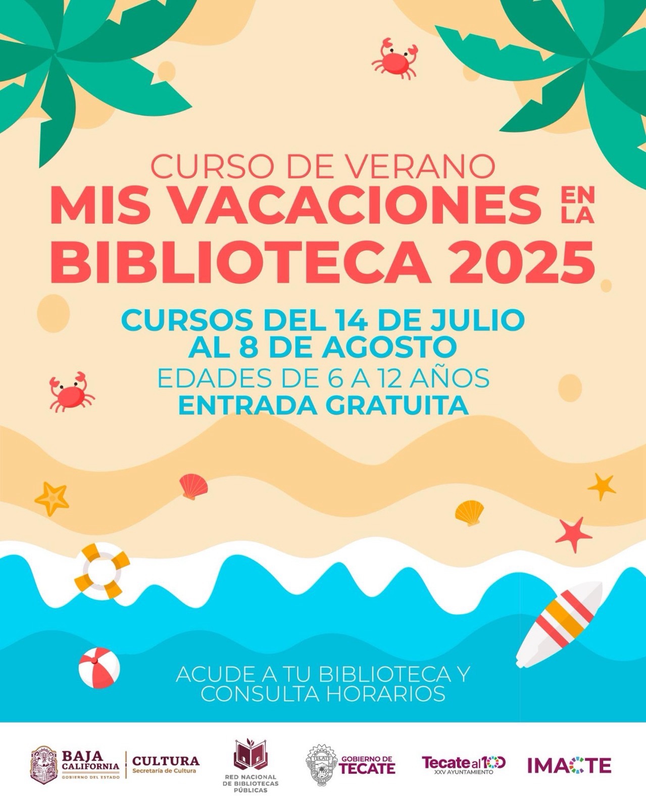 Tecate, Baja California a 18 de junio de 2025.– El Gobierno de Tecate, a través del Instituto Municipal de Arte y Cultura (IMACTE) y en coordinación con la Red Nacional de Bibliotecas Públicas, invita a niñas y niños de 6 a 12 años a participar en el tradicional curso de verano “Mis Vacaciones en la Biblioteca 2025”, el cual se llevará a cabo del 14 de julio al 8 de agosto en distintas sedes del municipio.