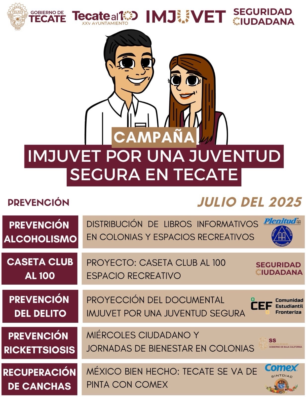Tecate, Baja California a 11 de julio de 2025.– Con el propósito de promover entornos seguros y saludables para las juventudes, el Instituto Municipal de la Juventud (IMJUVET), en coordinación con la Dirección de Seguridad Ciudadana y diversas instituciones aliadas, ha puesto en marcha la campaña “Por una juventud segura en Tecate”, la cual se desarrollará durante todo el mes de julio en distintas colonias del municipio.