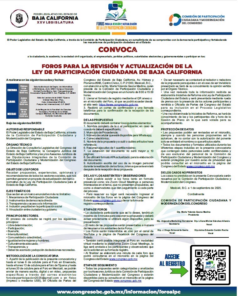 Mexicali, B.C., jueves 25 de septiembre de 2025.- El Poder Legislativo de Baja California a través de la Comisión de Participación Ciudadana, en cumplimiento de su compromiso con la democracia participativa y fortaleciendo los mecanismos de participación ciudadana, lanzó la convocatoria para las y los interesados en asistir a los Foros para la Revisión y Actualización de la Ley en la materia.