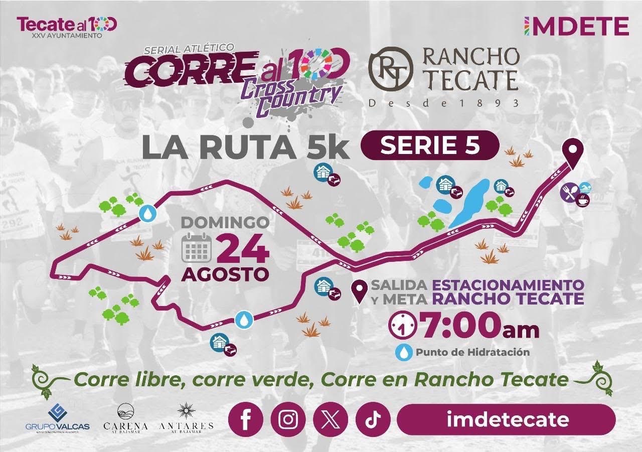 Tecate, Baja California, a 05 de agosto de 2025.– Como parte de las acciones para fomentar el deporte, la salud y la convivencia familiar, el Gobierno de Tecate encabezado por el alcalde Román Cota Muñoz, invita a participar en la quinta edición del Serial Atlético Corre al 100, una carrera tipo cross country que se llevará a cabo el próximo domingo 24 de agosto en los majestuosos paisajes de Rancho Tecate.