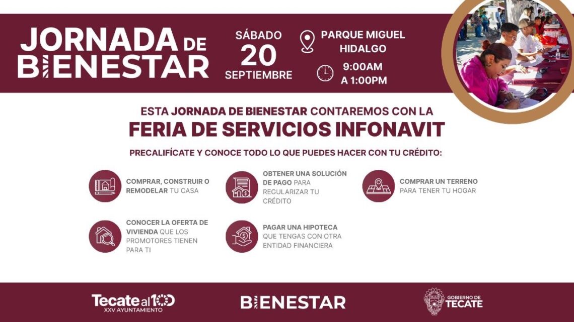 Tecate, Baja California a 18 de septiembre de 2025.– Con el propósito de acercar servicios que mejoren la calidad de vida de las familias tecatenses, el Gobierno de Tecate llevará a cabo su Jornada de Bienestar el próximo sábado 20 de septiembre en el Parque Miguel Hidalgo, en un horario de 9:00 de la mañana a 1:00 de la tarde, donde se contará con la Feria de Servicios de Infonavit.