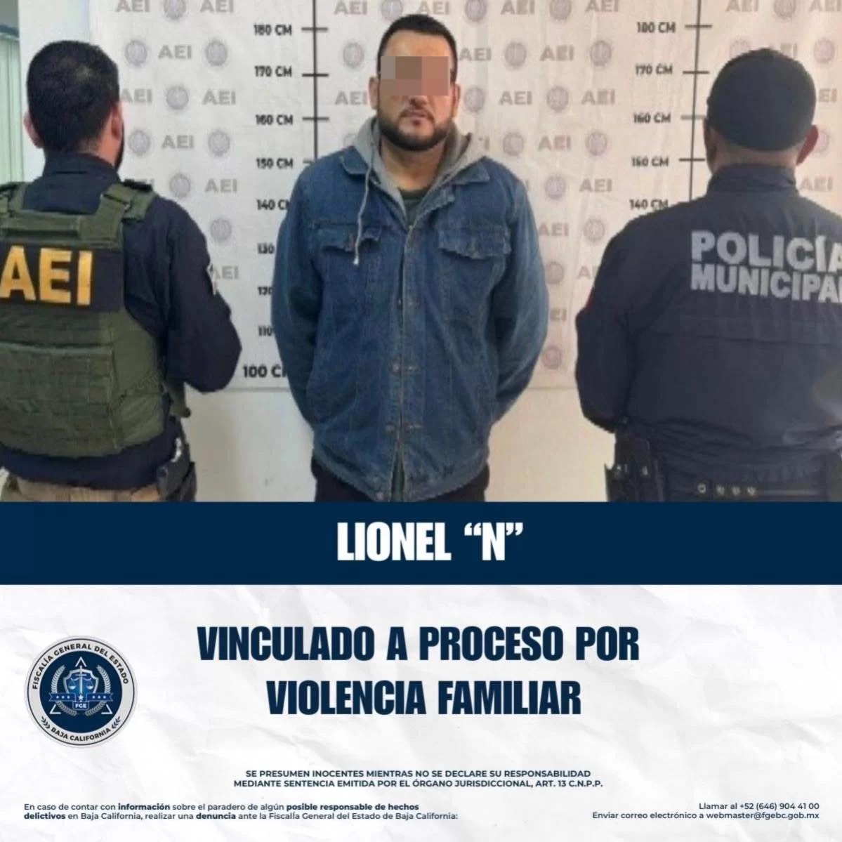 TECATE, B.C .- La Fiscalía Regional de Tecate, a través de la Unidad de Investigación de Delitos con Detenido, informa que se logró la vinculación a proceso de Lionel “N”, imponiéndose como medida cautelar la prisión preventiva, por su probable responsabilidad en los delitos de violencia familiar y delito federal, derivados de hechos ocurridos en esta ciudad.