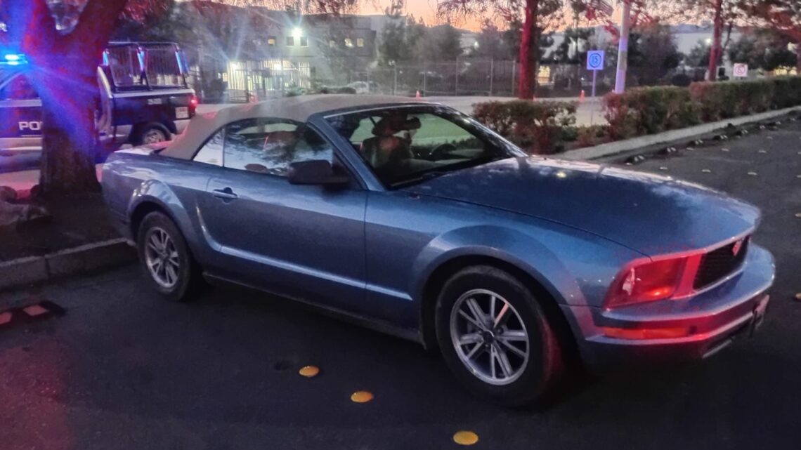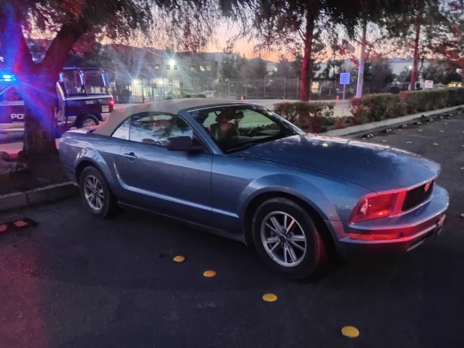 El segundo vehículo recuperado es un Ford Mustang, modelo 2005, tipo convertible, color azul, ubicado en el Parque Industrial El Bajío, específicamente en el estacionamiento de la empresa Baja Screen Print. Al realizar la inspección correspondiente, se corroboró que la unidad cuenta con reporte de robo vigente, con fecha de enero de 2026, en la ciudad de Tijuana.