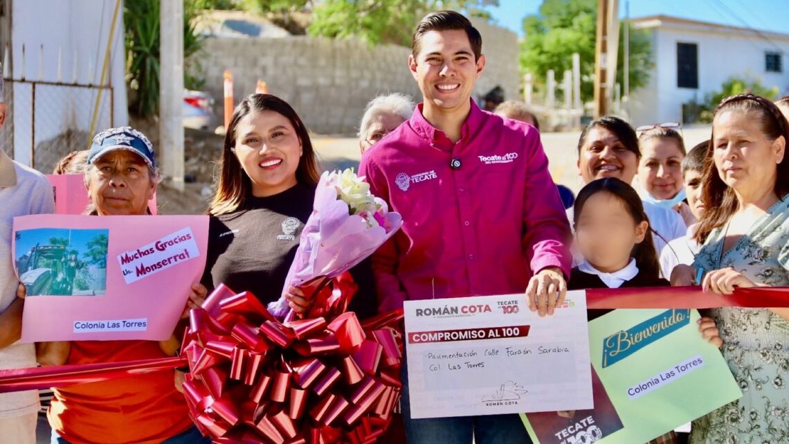 Tecate, Baja California a 29 de octubre de 2025. – Cumpliendo uno más de los compromisos asumidos con la ciudadanía, el alcalde Román Cota Muñoz encabezó esta tarde la inauguración de la pavimentación con concreto hidráulico de la calle Faraóm Sarabia, en el fraccionamiento Las Torres.