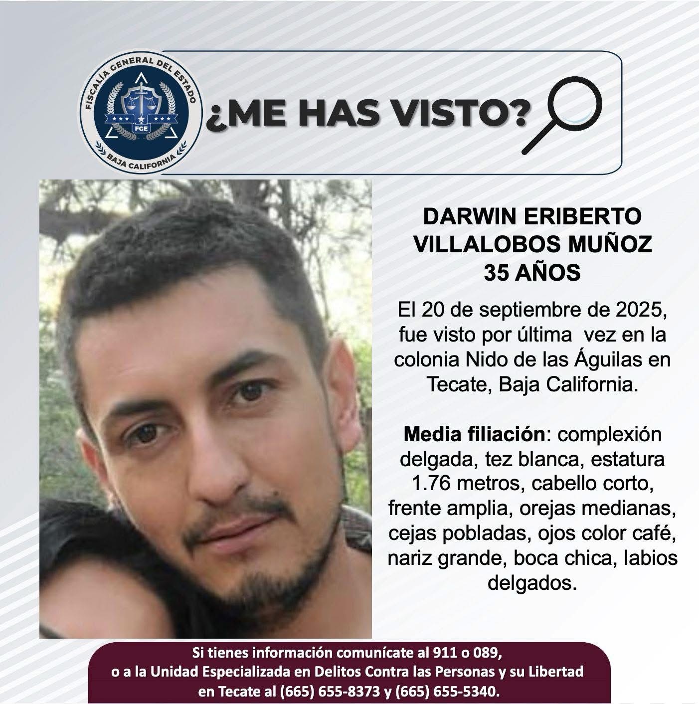 Tecate, Baja California.- La Fiscalía General del Estado, solicita el apoyo de la ciudadanía para localizar a Darwin Eriberto Villalobos Muñoz de 35 años de edad.