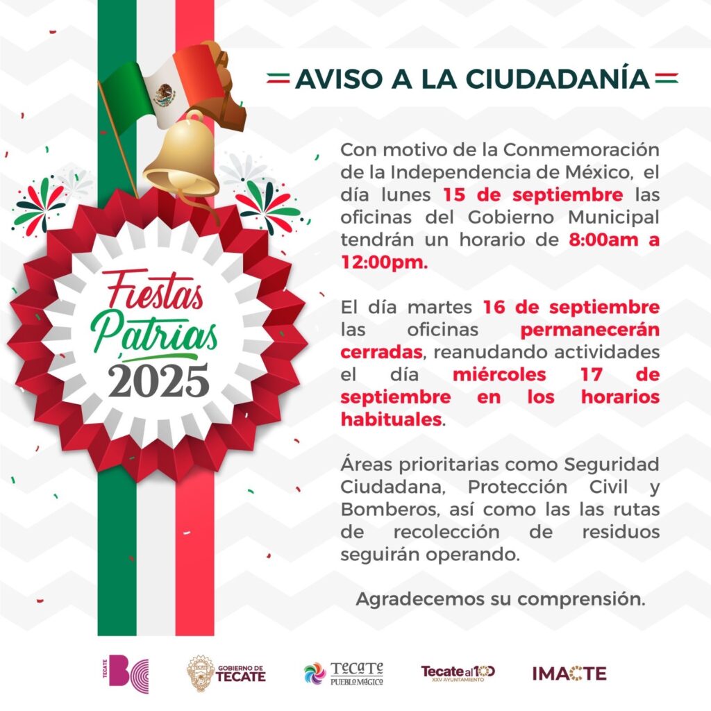 Tecate, Baja California a 15 de septiembre de 2025.- El Gobierno de Tecate informa que ya se encuentra todo preparado para la tradicional ceremonia del Grito de Independencia, que será encabezada por el alcalde Román Cota Muñoz en punto de las 11:00 de la noche, en la explanada de la Presidencia Municipal.
