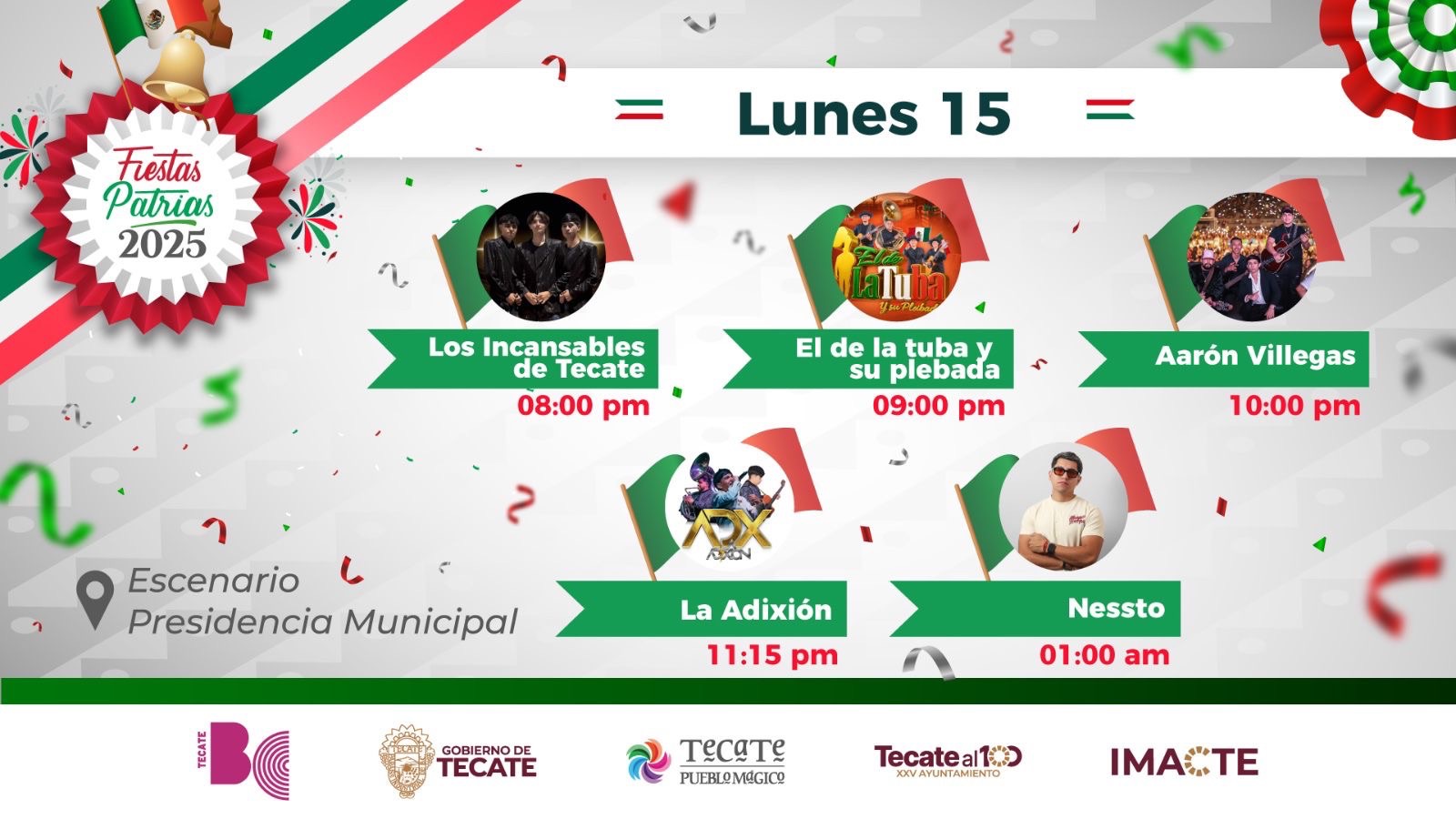 Previo al Grito de Independencia, las familias asistentes disfrutarán de un programa artístico y musical que dará inicio desde las 8:00 de la noche con la participación de Los Incansables de Tecate, El de la Tuba y su Plebada, Aarón Villegas, La Adixión y Nessto, en un ambiente de fiesta y tradición.