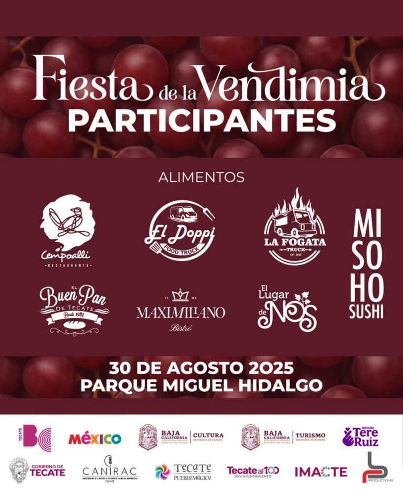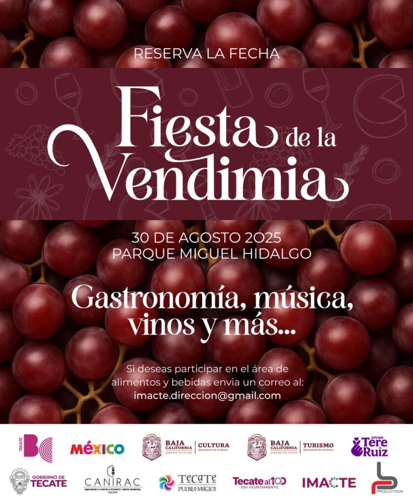 Tecate, Baja California a 25 de agosto de 2025. – El Gobierno de Tecate, a través del Instituto Municipal de Arte y Cultura de Tecate (IMACTE), anunció la realización de la Fiesta de la Vendimia 2025, un encuentro cultural y gastronómico que enaltece la tradición vitivinícola de nuestro municipio, considerado la puerta norte de la Ruta del Vino en Baja California.