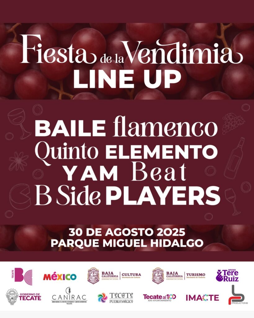 El programa artístico contempla un mosaico cultural con estampas de la Vendimia de Ensenada, un espectáculo de baile flamenco, así como presentaciones musicales que incluyen Quinto Elemento con su estilo de cumbia, Yam Beat con ritmos caribeños, y el cierre estelar de B Side Players, agrupación muy querida por el público tecatense.
