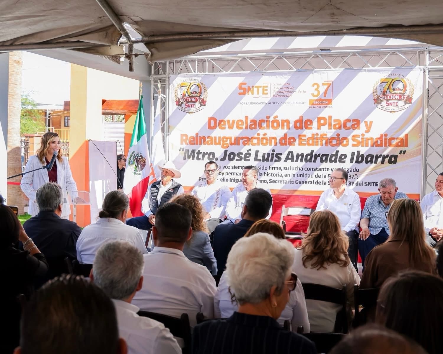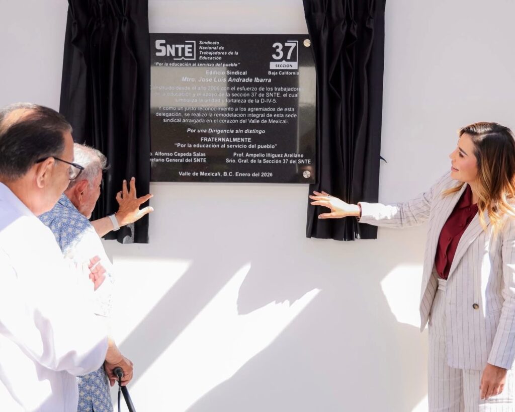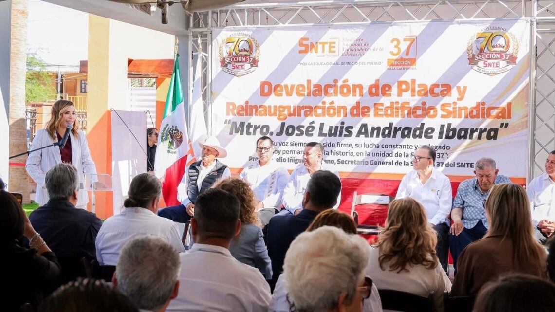 La mandataria también fue testigo de la reinauguración del edificio sindical de la Sección 37 en el Valle de Mexicali, que ahora lleva el nombre de José Luis Andrade Ibarra, docente jubilado y exsecretario general del sindicato, a quien reconoció como un actor fundamental en la conquista de los derechos del magisterio en México y en Baja California.